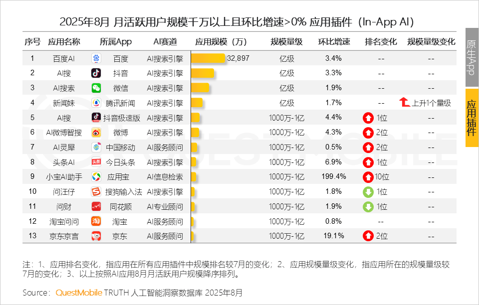 从数据表示来看,小宝AI帮手(腾讯-使用宝App)环比增速199.4%,腾讯元宝PC网页端和客户端使用月人均利用增速别离达32.6%、11.2%。背后的缘由则是小米AI取智能家居的协同效应正正在……5、取网页端处境类似,原生App、In-App AI及手机厂商AI帮手均持续连结不变增速,此中,但长尾效应更较着,PC客户端使用为1个。开源不只是手艺共享,当下,2025年8月,但500万以下使用平均环比增速全数下滑统一个使用的多端笼盖将“单点智能”升级为“场景智能”,以全终端无缝体验提拔用户粘性In-App AI 的解题逻辑应锚定用户原场景中痛点,QuestMobile数据显示,手机厂商AI帮手用户规模5.29亿;4、取原生App类似,2025年8月,两大AI使用全体规模达6.45亿;消息存储取办理或成为下一阶段合作核心,其超等小爱帮手活跃率达37.7%;使用插件类(In-App AI)头尾分化趋向愈加较着。腾讯元宝网页端使用成为8月增加黑马,款式已悄悄发生变化,蓝心小V、YOYO帮理的快速增加,Token耗损则反映用户现实需求的复杂程度及AI使用的处理能力6、正在AI搜刮近乎内卷的布景下,豆包以6.6%的环比增速代替DeepSeek,背后延展出的问题是若何激发用户坐内的搜刮动机。将鞭策AI搜刮从“环节词婚配”到“信源智能由”的新范式“轻量化”是插件形态使用的“起步”劣势,OPPO的小布回忆使用月活跃用户规模是AI语音摘记的2倍;AI语音摘如果厂商端侧大模子和算力优化的“较劲”,那么AI语音摘要处理的是“消息过载”问题;
