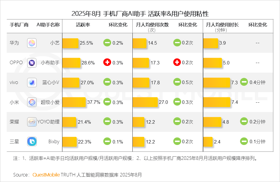 QuestMobile数据显示,次数取时长的博弈意味着将来AI帮手需要从简单的“功能触发”向“糊口帮理”转型QuestMobile数据显示,六成以上客户端使用用户规模正在100万以下,更是贸易价值的泉源2、活跃率及粘性目标则从另一个角度注释用户对AI帮手的依赖程度;OPPO、小米、华为旗下AI帮手用户占比别离达70.9%、70.4%和56.8%;以及提拔模子根本能力、加强数据供给立异、强化算力统筹和推进开源生态等八大支持点,截止到2025年8月,前途,